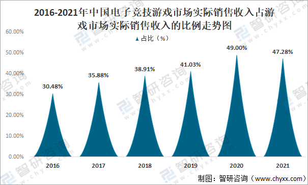 2016-2021年中國電子競技游戲市場實際銷售收入占游戲市場實際銷售收入的比例走勢圖