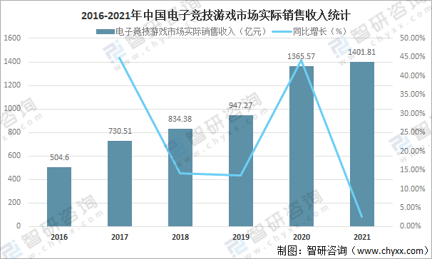 隨著中國電子競技游戲用戶規模的快速增長,銷售收入也隨之增加,2021年中國電子競技游戲市場實際銷售收入達1401.81億元,較2020年增加了36.24億元,同比增長2.65%,2021年中國電子競技游戲市場實際銷售收入增幅較去年同比縮減約42%,增速放緩,主要原因是,電競游戲銷售收入是電競市場的主要收入來源,受整體游戲市場的影響導致電競市場收入規模增幅下降;今年持續受到疫情的影響,重要電競賽事線下活動減少,而線上模式很難實現商業變現;未成年人網絡游戲防沉迷的政策要求,對俱樂部和賽事的商業運營均產生一定影響。