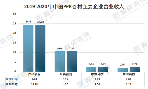2020年偉星新材、顧地科技、永高股份、雄塑科技的PPR管材的營業收入分別為24.18億元、10.60億元、2.34億元和2.24億元。