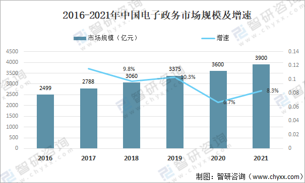 2016-2021年中國電子政務市場規模及增速