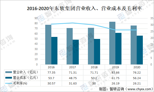 2020年東軟集團營業收入為76.22億元,同比下降8.9%;東軟集團營業成本為56.24億元,同比下降8.9%;東軟集團毛利率為26.21%。