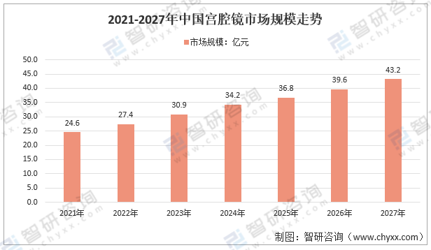 受益于行業政策的支持、下游市場需求的增加及普及程度的快速,預計2021年我國宮腔鏡市場規模為24.61億元,到2027年市場規模將達到約43.2億元。