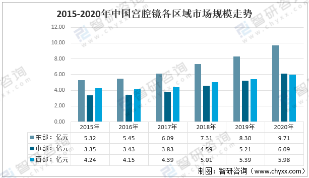 2015-2020年中國宮腔鏡各區域市場規模走勢