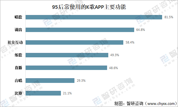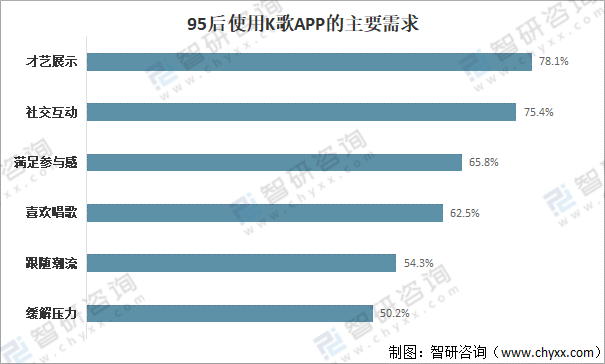 K歌APP能滿足多數(shù)95后用戶的需求,而由于95后K歌用戶善于個性表達,才藝展示為首要需求,占比達78.1%,其次是社交互動和滿足參與感,占比分別為75.4%和65.8%。