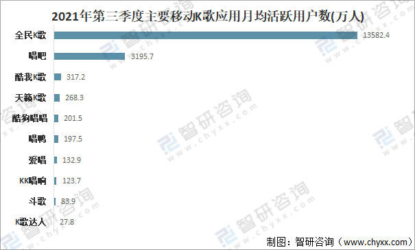 2021年第三季度主要移動K歌應(yīng)用月均活躍用戶數(shù)統(tǒng)計(萬人)