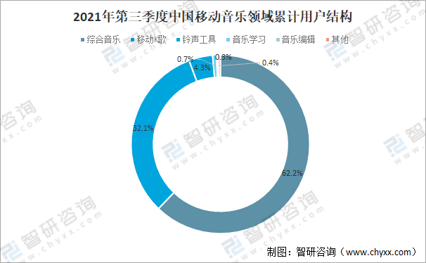 在移動音樂領(lǐng)域累計用戶結(jié)構(gòu)分布中,綜合音樂排名第一位,用戶占比超6成,其次為移動K歌,成為移動音樂領(lǐng)域的重度應(yīng)用類別,占比達32.1%。