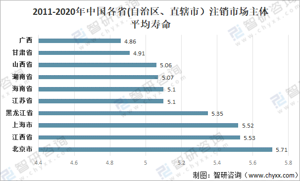 2011-2020年中國北京市注銷主體平均壽命5.71年,排名第一;江西省注銷主體平均壽命5.53年,排名第二;上海市注銷主體平均壽命5.52年,排名第三;黑龍江省注銷主體平均壽命5.35年,排名第四;江蘇省注銷主體平均壽命5.1年,排名第五。