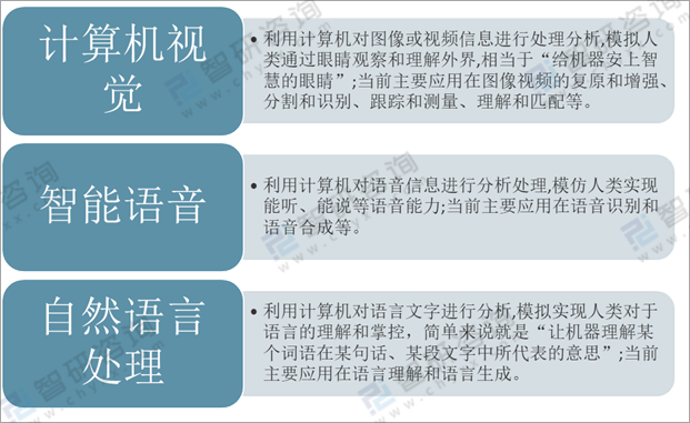 目前,Al領域已有十余種行業技術,主要包括:知識表示、自動推理和搜索方法、機器學習和知識獲取、知識處理系統、自然語言理解、計算機視覺、智能機器人、自動程序設計等方面。其中“計算機視覺、智能語音、自然語言處理”是三大主要方向。