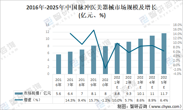 2016年-2025年中國脈沖醫美器械市場規模及增長(億元、%)