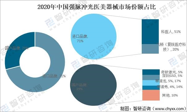 2020年中國脈沖光醫美器械市場也主要依賴進口,進口強脈沖光醫美器械市場份額71%,其中科醫人51%,飛頓(復銳醫療科技)20%,國產品牌奇致激光、深圳GSD、賽諾龍、賽諾秀市場份額分別為5%、5%、5%、4%,已形成較強的市場競爭力。