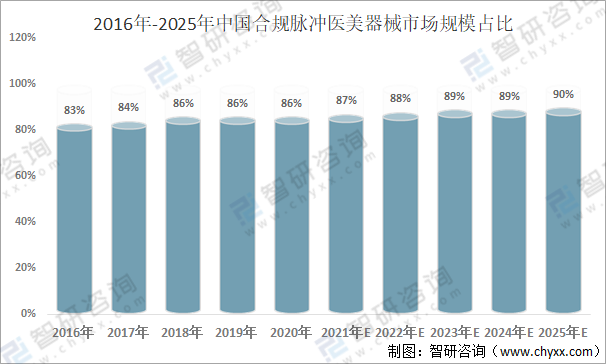 2016年-2025年中國合規脈沖醫美器械市場規模占比