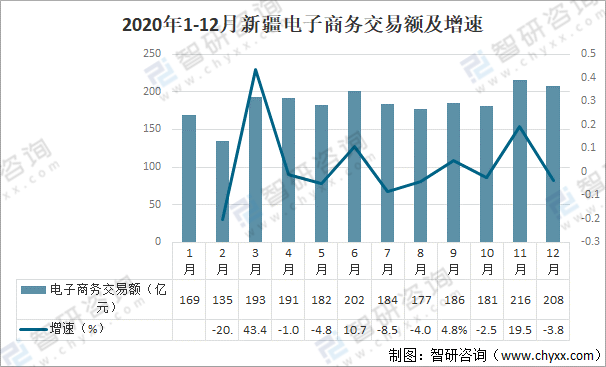 2020年1-12月新疆電子商務(wù)交易額及增速