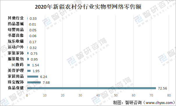 2020年新疆農(nóng)村分行業(yè)實(shí)物型網(wǎng)絡(luò)零售額