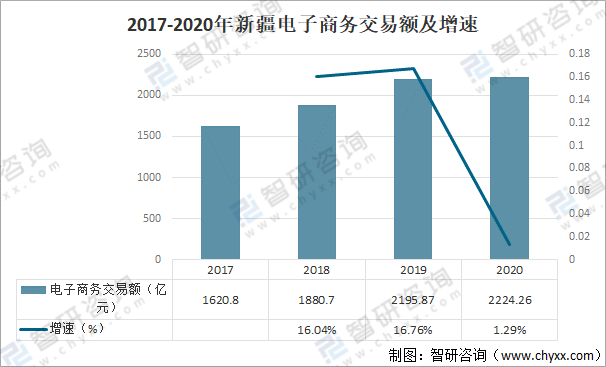 2020年,新疆電子商務(wù)額達(dá)2224.26億元,較上年增加28.39億元,同比增速1.29%。其中,大宗商品及B2B商品交易額1807.45億元,網(wǎng)絡(luò)零售額416.81億元,同比增速12.14%。