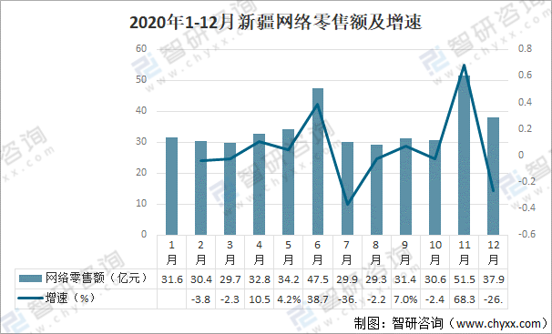 2020年1-12月新疆網(wǎng)絡(luò)零售額及增速
