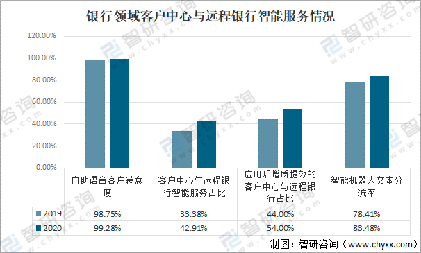 2020年,客戶中心與遠程銀行智能服務占比為42.91%,自助語音客服滿意度已達99.28%,應用智能語音導航或場景機器人后簡化客戶操作、提高服務效率的客服中心與遠程銀行達到54%,微信、在線、APP等渠道的智能機器人文本分流率達到83.48%。