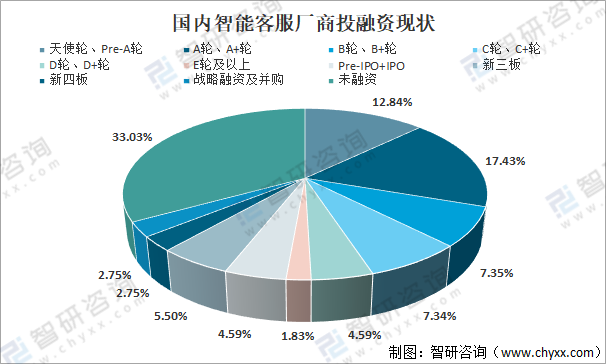 國內智能客服廠商已獲得融資的廠商占比超過65%,天使輪和 Pre-A 輪占比12.48%,A輪至E輪占比38.53%;另外,新三板公司共計6家,新四板公司共計3家。