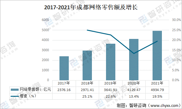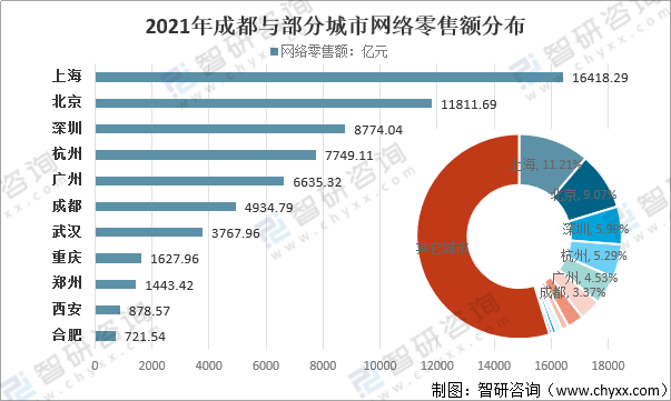 疫情防控推動社區團購蓬勃發展,成為民生服務有效渠道。2020年、2021年成都實現電子商務交易額中網絡零售額分別為4129.47億元、4934.79億元,均排在在全國主要城市中排名第6位,同比增長率分別為13.39%、19.50%。2021年成都網絡零售額占全國的3.37%。