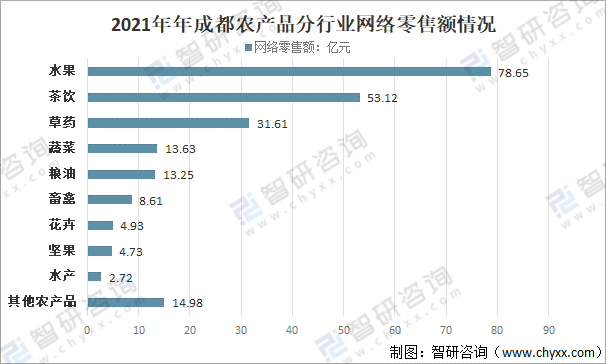 2021年成都農產品網絡零售額實現226.23億元,同比增長37.14%,相對靠前的行業分別為水果網絡零售額實現78.65億元,排名第一位;茶飲網絡零售額實現53.12億元,排名第二位;草藥網絡零售額實現31.61億元,排名第三位。蔬菜、糧油、畜禽、花卉、堅果、水產依次擠進前九。橘子、茉莉花茶、麥茶等品類線上最為暢銷。