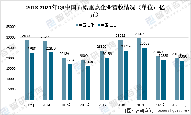 中國主要生產石蠟的企業集中在中國石化和中國石油兩大集團。2021年Q3季度,中國石化營業收入為20034億元,中國石油營業收入為18803億元。