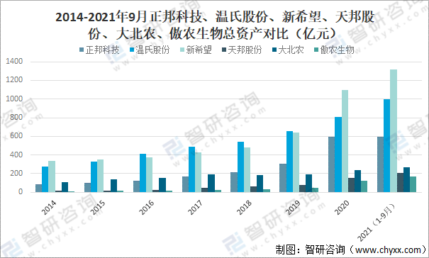 2014-2021年9月正邦科技、溫氏股份、新希望、天邦股份、大北農、傲農生物總資產對比(億元)