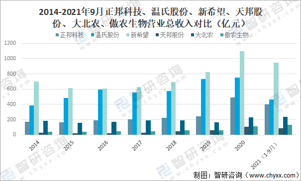 2014-2021年9月正邦科技、溫氏股份、新希望、天邦股份、大北農、傲農生物營業總收入對比(億元)
