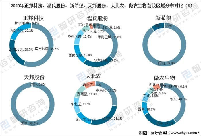 2020年正邦科技、溫氏股份、新希望、天邦股份、大北農、傲農生物營收區域分布對比(%)