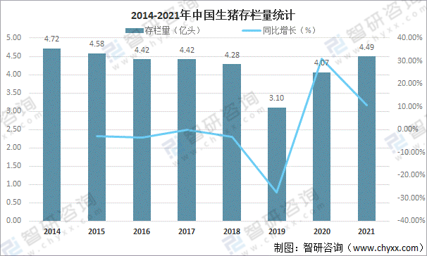 隨著我國生豬養殖技術的不斷提升,生豬存欄量快速增長,2021年中國生豬存欄量達4.49億頭,較2020年增加了0.4億頭,同比增長10.51%,目前我國養豬產業逐漸向著現代化以及規模化的方向不斷發展。