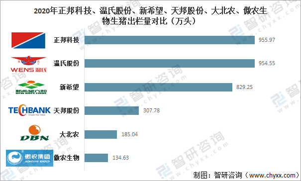 從生豬出欄量來看,2020年正邦科技生豬出欄量為955.97萬頭;溫氏股份生豬出欄量為954.55萬頭;新希望生豬出欄量為829.25萬頭;天邦股份生豬出欄量為307.78萬頭;大北農生豬出欄量為185.04萬頭;傲農生物生豬出欄量為134.63萬頭。