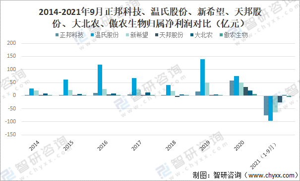 2014-2021年9月正邦科技、溫氏股份、新希望、天邦股份、大北農、傲農生物歸屬凈利潤對比(億元)