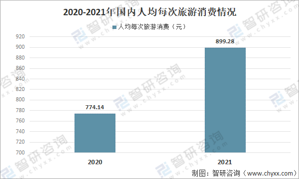 2020年,國內人均每次出游花費774.14元,比上年同期下降18.8%;2021年,國內人均每次旅游消費899.28元,比上年同期增加125.14元,同比增長16.2%。