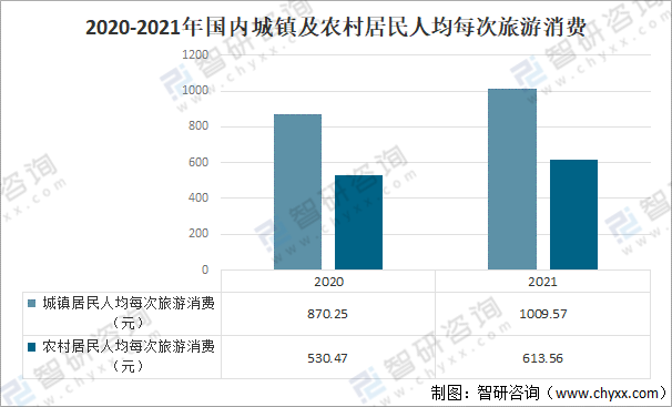 2020-2021年國內城鎮及農村居民人均每次旅游消費