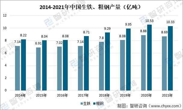 2014-2021年中國生鐵、粗鋼產量(億噸)