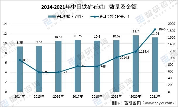 2014-2021年中國鐵礦石進口數量及金額