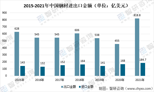 根據中國鋼鐵工業協會數據顯示,2021年中國鋼材出口金額為818.8億美元,進口金額為184.7億美元。