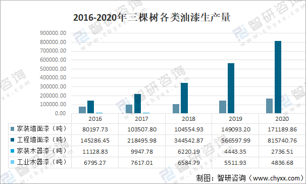 2016-2020年三棵樹各類油漆生產量