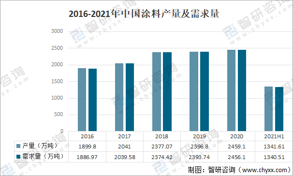 2016-2021年中國涂料產量及需求量
