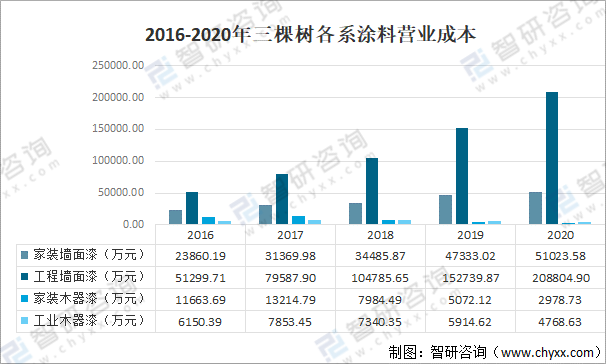 2016-2020年三棵樹各系涂料營業成本