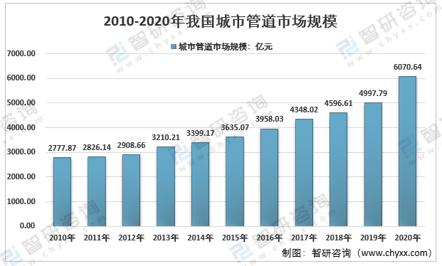 近幾年,我國城市管網市場規模整體呈現增長態勢。我國城市管網市場規模從2010年的2777.87億元增長到了2020年的6070.64億元。如下圖所示: