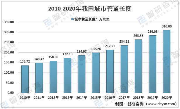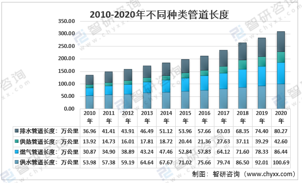 根據住建部發布的最新統計數據:2020年我國城市管道長度約310萬公里,其中供水管道總長度為100.69萬公里,天然氣管道長度為85.06萬公里,供熱管道長度為42.60萬公里,排水管道長度為80.27萬公里。