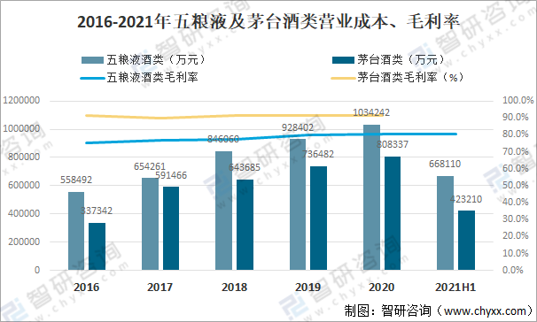 2016-2021年五糧液及茅臺(tái)酒類營(yíng)業(yè)成本、毛利率