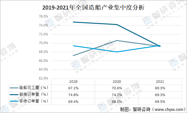 2021年,我國造船企業國際競爭力進一步增強,各有6家企業分別進入全球造船完工量、新接訂單量和手持訂單量前10強。產業集中度保持在較高水平,造船完工量前10家企業占全國總量的69.3%;新接訂單量前10家企業占69.3%;手持訂單量前10家企業占69.5%。
