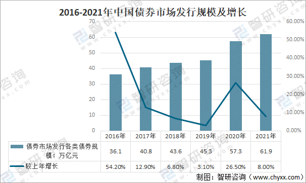 2016-2021年中國債券市場發(fā)行規(guī)模及增長