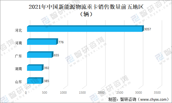 中國新能源物流重卡銷售數量中河北、河南、廣東、山東、四川居前五,累計占比近7成(69.9%),河北地區獨大,累計銷量3057輛,也是2021年唯一一個新能源物流重卡累計銷量超越1000輛的省份。