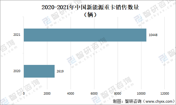 2021年在國家“雙碳”戰略的推動下,新能源重卡成了重卡市場中最大的亮點,也給今后我國重卡的電動化帶來了新的希望。2021年中國新能源重卡累計銷售10448輛,同比增長298.9%。
