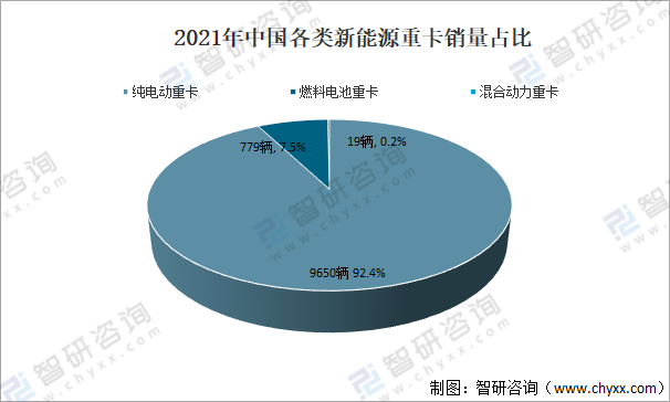 中國純電動重卡占據新能源重卡的份額超9成,成為拉動2021年新能源重卡市場增長的最大“功臣”。2021年中國純電動重卡銷量9650輛,同比增長273.3%,占據新能源重卡的市場份額為92.4%;而燃料電池重卡銷量只有779輛,雖然同比漲幅高達42.28倍,但占據新能源重卡的份額只有7.46%;混合動力重卡只銷售19輛,占比只有0.18%。