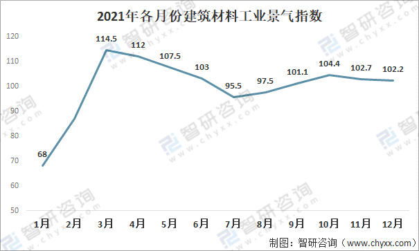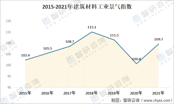 中國建筑材料聯(lián)合會數(shù)據(jù)顯示:2021年,建筑材料工業(yè)年度景氣指數(shù)(MPI)109.7點,比上年回升8.9點,景氣度明顯回升。
