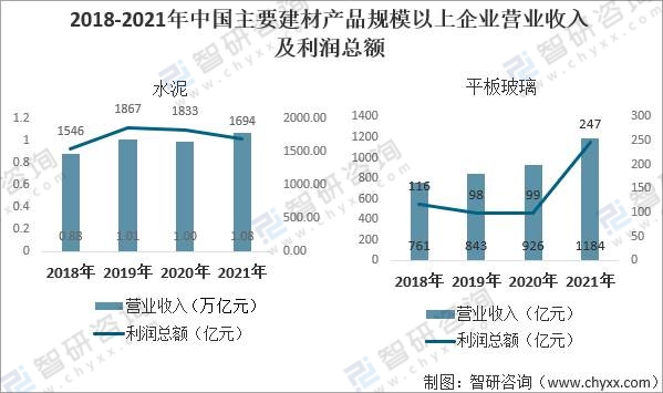 2018-2021年中國主要建材產(chǎn)品規(guī)模以上企業(yè)營業(yè)收入及利潤總額