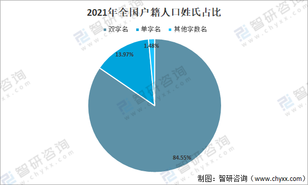 在常見名字的地理分布中,名字也具有特定的地域分布特征。全國戶籍人口中,除姓氏外,單字名占13.97%,雙字名占84.55%,其他字數名字占1.48%。