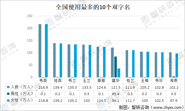 全國戶籍人口中,使用頻率最高的10個雙字名依次為秀英、桂英、秀蘭、玉蘭、婷婷、建華、桂蘭、玉梅、秀珍、海燕。其中“秀英”名列榜首,使用人數為216.9萬。男性使用較多的雙字名僅有“建華”;其余常見雙字名為女性使用較多,重名率明顯高于男性。